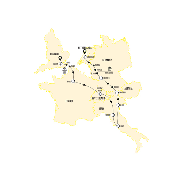 Dive into Europe’s endless charm on this 14-day journey from London to Amsterdam. You’ll tick bucket list European experiences as you travel from the Swiss Alps to Italy. Experience the canals of Venice, wander Austria’s scenic wonders and soak in the Rhineland’s beauty before ending in Amsterdam, the city of canals and creativity.