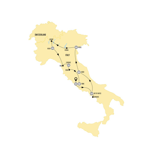 Discover the splendor of 'la bella Italia' on this 13-day journey through charming countrysides, picturesque towns, and vibrant cities. Explore the ancient history of Rome, the tranquil beauty of the Italian Lakes, and the artistic brilliance of Florence. Find quiet inspiration in Assisi, soak up the sun along the Bay of Naples, and discover why Italy’s allure is truly unmatched.